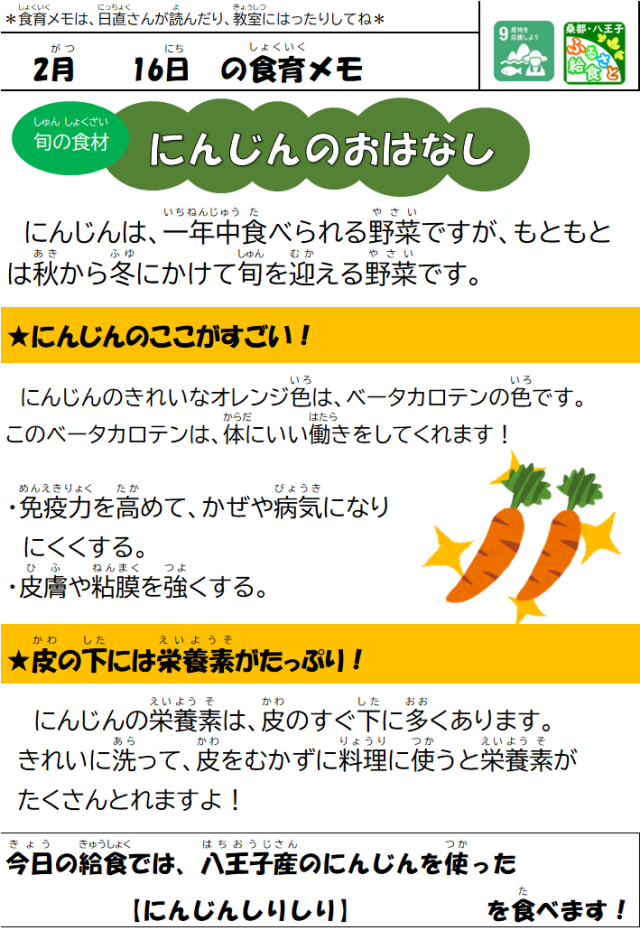 2月16日(月)の給食 公開日 2026/02/17 更新日 2026/02/16 給食室 【メニュー】・ごまごはん・さわらのゆずおろしあんかけ・田舎汁・にんじんしりしり・牛乳【八王子産の食材】大根(有機)、にんじん(有機) いいね(0)