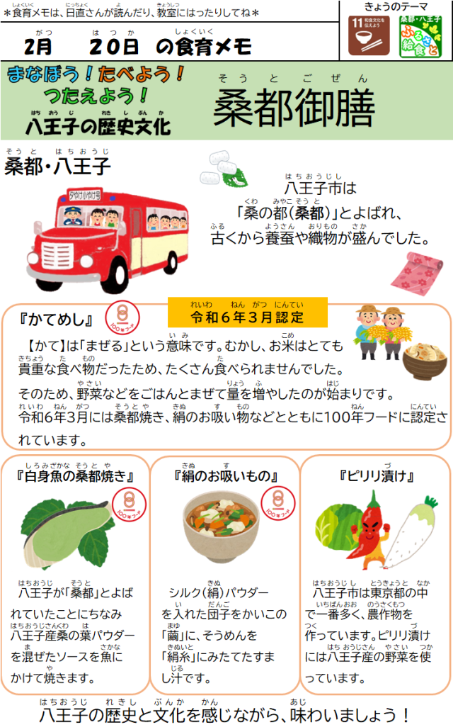 2月20日(金)の給食 公開日 2026/02/24 更新日 2026/02/20 給食室 【メニュー】・かてめし・白身魚の桑都(そうと)焼き・ピリリ漬け・絹のお吸い物・牛乳【八王子産の食材】にんじん、大根 いいね(0)