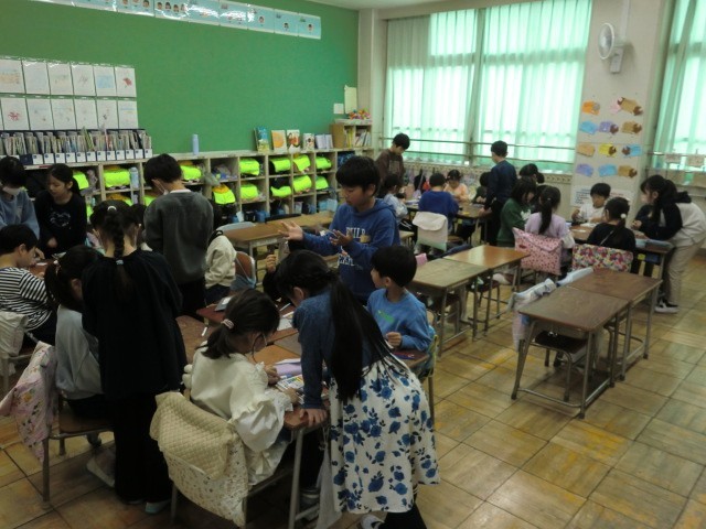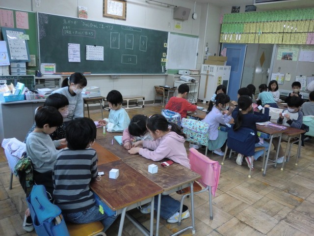 今日は1年生に、びゅんびゅんごまの作り方を教えてあげました。どうしたらよく回るかを試行錯誤してきて、回し方も上手になってきた2年生。教えてあげた1年生が回せるようになると、1年生以上に2年生が嬉しそうで、「やった~!」という声があちこちで上がっていました。1年生への伝授は大成功です!