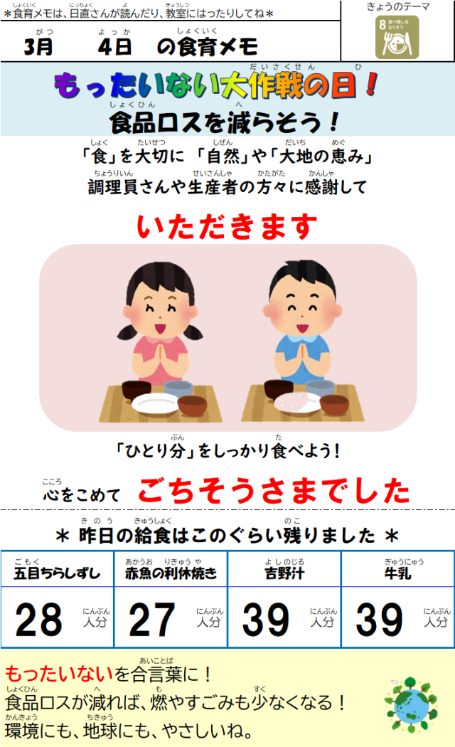 3月4日(水)の給食 公開日 2026/03/04 更新日 2026/03/04 給食室 【メニュー】・やきとり丼・呉汁・れんこんチップス・牛乳【八王子産の食材】長ねぎ、にんじん、大根、小松菜 いいね(0)
