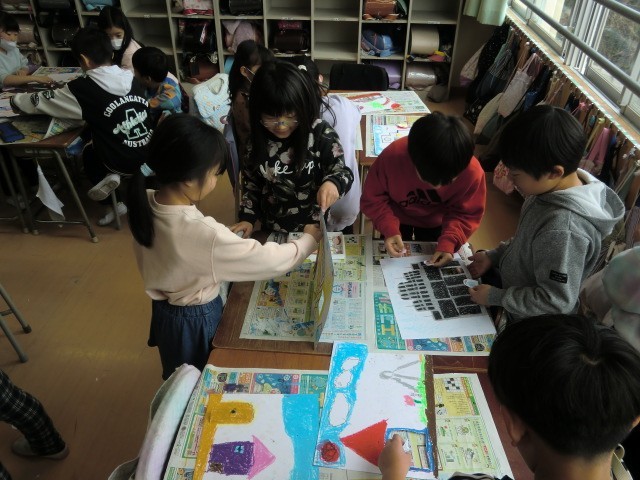 図画工作では、『あなでつながる二つのせかい』という学習をしました。カッターナイフを使って画用紙に穴をあけると、こちらとむこうがつながっていて、オリジナルのマスコットが行き来するという作品です。できあがった作品を友達に紹介しながら、マスコットが行ったり来たり…。そのうち、自分たちで物語を考えて、その世界に入り込んでいく姿に、子どもたちの発想力って無限大だなぁと感心させられました。1年間、図画工作の時間に作成した作品は、来週、図工バックにまとめて持ち帰ります。是非、見てあげてください。