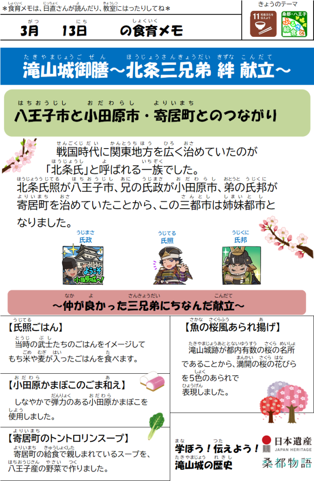 3月13日(金)の給食 公開日 2026/03/13 更新日 2026/03/13 給食室 【メニュー】・氏照ごはん・魚の桜風あられ揚げ・小田原かまぼこのごま和え・寄居町のトントロリンスープ・牛乳【八王子産の食材】にんじん、小松菜 いいね(0)
