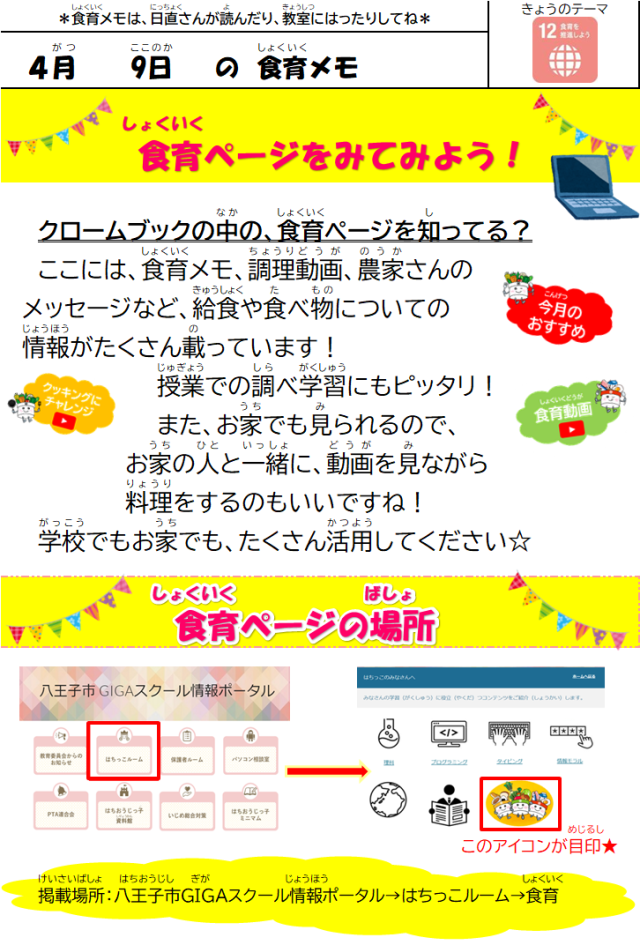 4月9日(木)の給食 公開日 2026/04/09 更新日 2026/04/09 給食室 【メニュー】・きなこ揚げパン・白菜のクリームスープ・カリカリじゃこサラダ・果物(きよみ)・牛乳【八王子産の食材】小松菜 いいね(0)