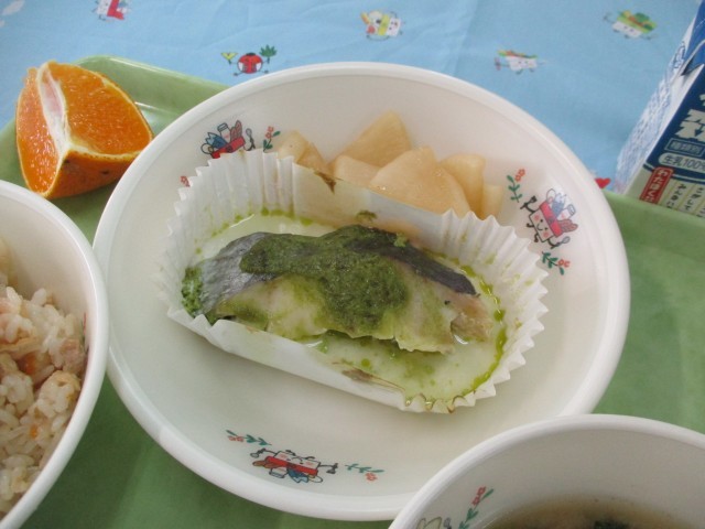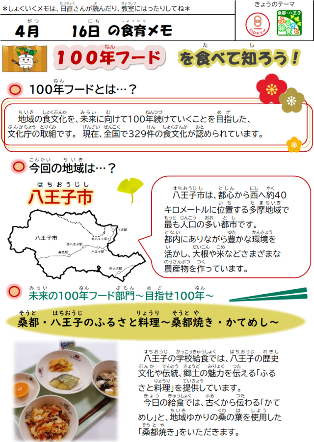 4月16日(木)の給食 公開日 2026/04/17 更新日 2026/04/17 給食室 【メニュー】・かてめし・白身魚の桑都(そうと)焼き・大根の風味漬け・はっちくんのみそ汁・果物(でこぽん)・牛乳【八王子産の食材】桑の葉(粉)、しいたけ、小松菜、かぶ(有機) いいね(0)