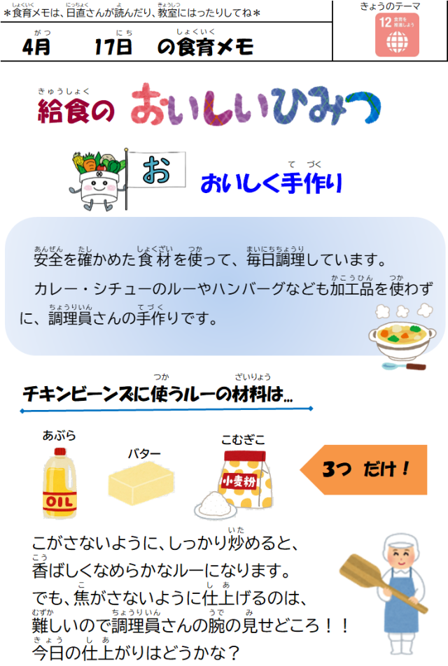 4月17日(金)の給食 公開日 2026/04/17 更新日 2026/04/17 給食室 【メニュー】・食パン・手作りミックスジャム・チキンビーンズ・ツナサラダ・牛乳【八王子産の食材】キャベツ、小松菜 いいね(0)