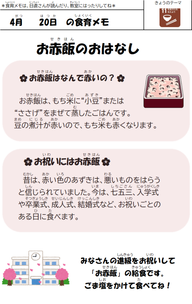 4月20日(月)の給食 公開日 2026/04/20 更新日 2026/04/20 給食室 【メニュー】・赤飯・鶏のから揚げ・野菜のおひたし・お祝いすまし汁・果物(きよみ)・牛乳【八王子産の食材】長ねぎ、小松菜 いいね(0)