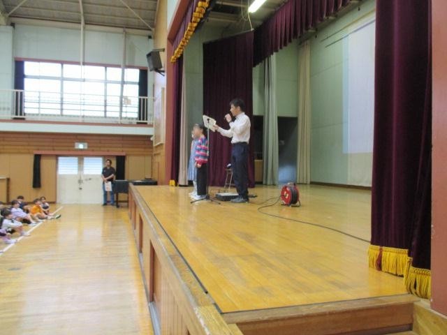 全校朝会を体育館で行いました。校長先生からは、絵本作家の五味太郎さんの「挨拶絵本」という絵本をもとに、「いろいろな場面や状況においての挨拶を考えてみよう」というお話がありました。子どもたちはスライド画面を見ながら、場に応じた挨拶の言葉を元気に言うことができていました。