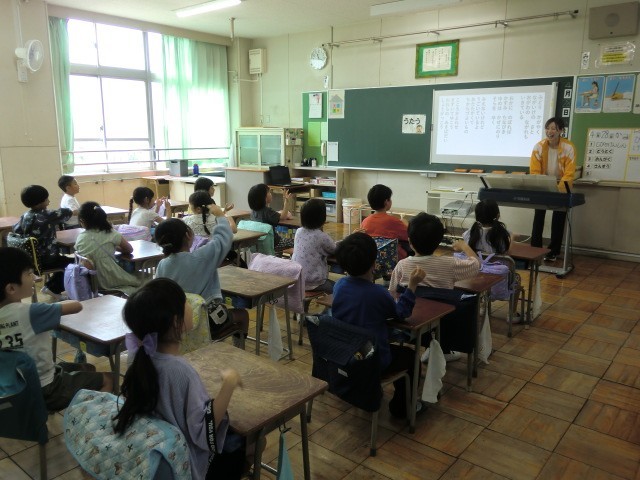 音楽の授業では、運動会に向けて「校歌」や「ゴーゴーゴー」の練習が始まりました。難しい歌詞も振りを付けることで、どんどん覚えていく1年生。運動会では、お兄さんお姉さんたちと一緒に歌います。お家でも歌っている子がいるようですね。是非、聞いてあげてください!