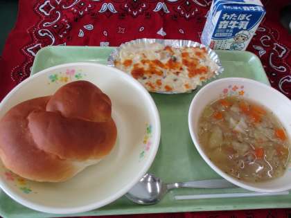 ☆今日の給食☆ *ミルクパン *マカロニグラタン *やさいのスープ煮 *牛乳