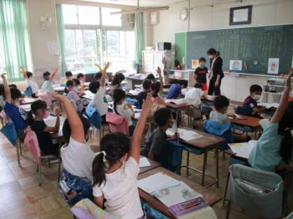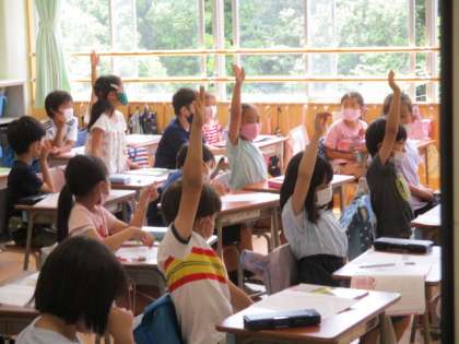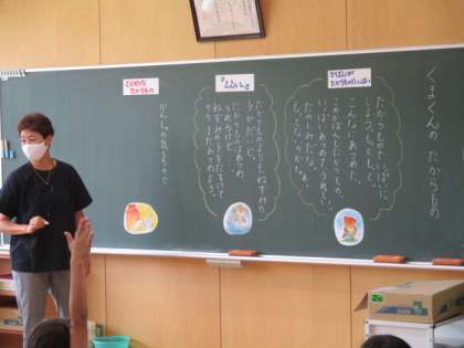 「くまくんのたからもの」を通して親切について考えました。日常生活の中で親切にした経験からその時の気持ちを思い起こし、自分でやってみたい親切について考えるきっかけをつくりました。