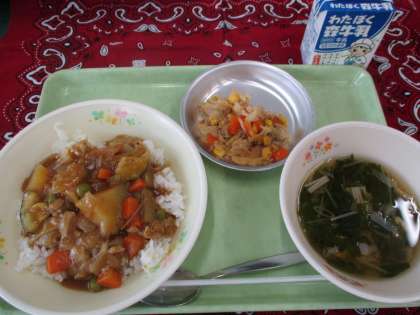 6月23日(水)の給食 公開日 2021/06/24 更新日 2021/06/24 給食室 ☆今日の給食☆ *八王子産ズッキーニのカレーライス *じゃこサラダ *みずなととうふのスープ *牛乳 カレーライスには八王子でとれたズッキーニが 入っています。食感を残すために 油で炒めて仕上げに加えました。 いいね(0)