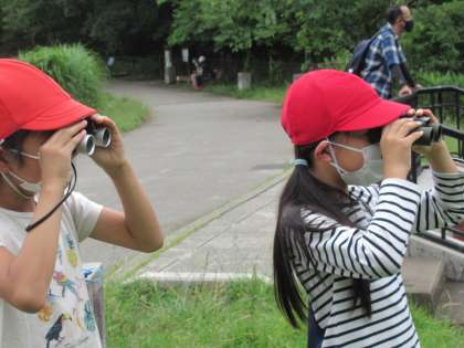 双眼鏡を覗いて、野鳥を見つけたり、鳴き声を聞き分けたりしながら楽しく観察しました。