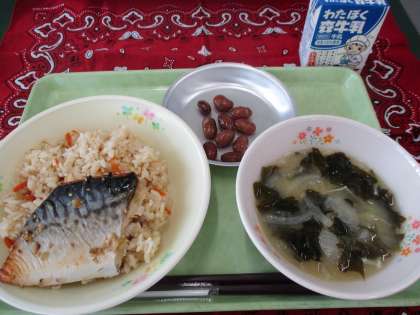 ☆今日の給食☆ *にんじんごはん *さばのねぎしお焼き *にまめ *だいこんのみそ汁 *牛乳