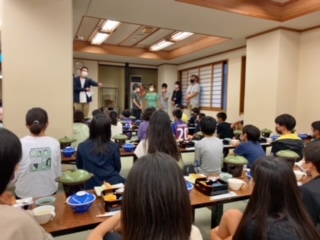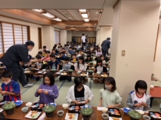 大勢での食事。一方向を向いて、お秋な声を出さずにしています。それでも楽しい気持ちになってきます。