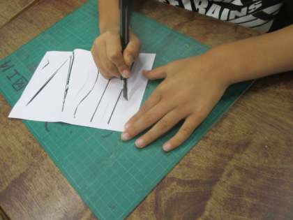 2年生はたくさんの窓の形のある建物、立体作品を作ります。今回はカッターを使って作品を作ります。今週はカッターの使い方を学習しました。切り方や持ち方などを伝えると、「切るときは、『チクッ』『スーッ』『ピタッ』が大事です。」「カッターは危ないから使い方を注意しないといけない。」「ハサミでは切れない場所が切れるからたくさんの表現ができる。おもしろい。」などを述べました。新しい用具の扱い方を知り、切る心地よさを感じることができました。