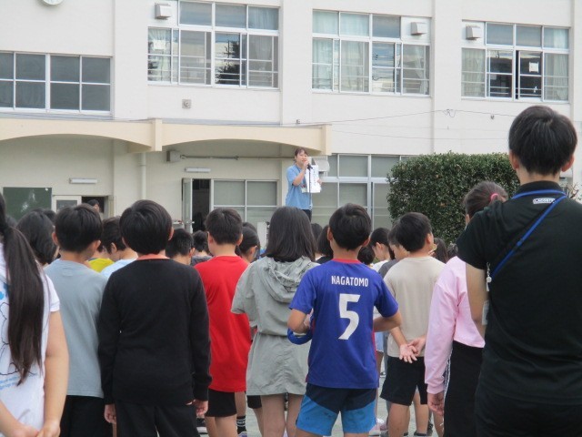 今朝は、校庭に全校児童が集まり、10月の全校朝会を行いました。