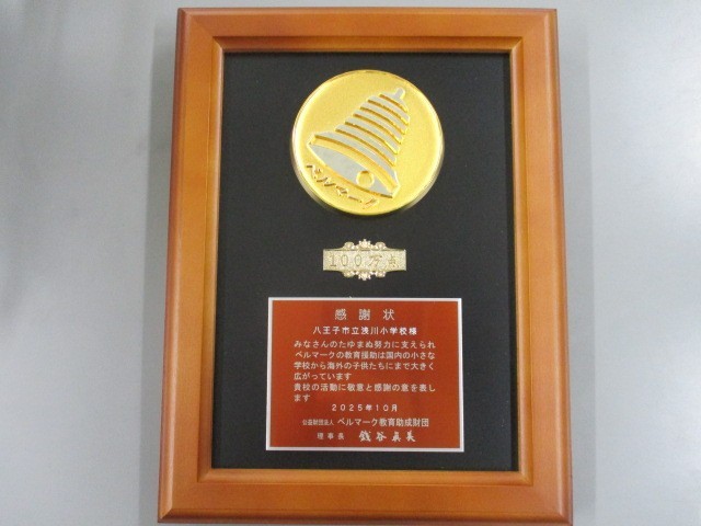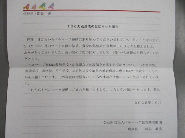 本日、公益財団法人ベルマーク教育助成財団より、「100万点達成のお知らせと御礼」のお手紙、そして感謝状としての記念盾が届きました。
