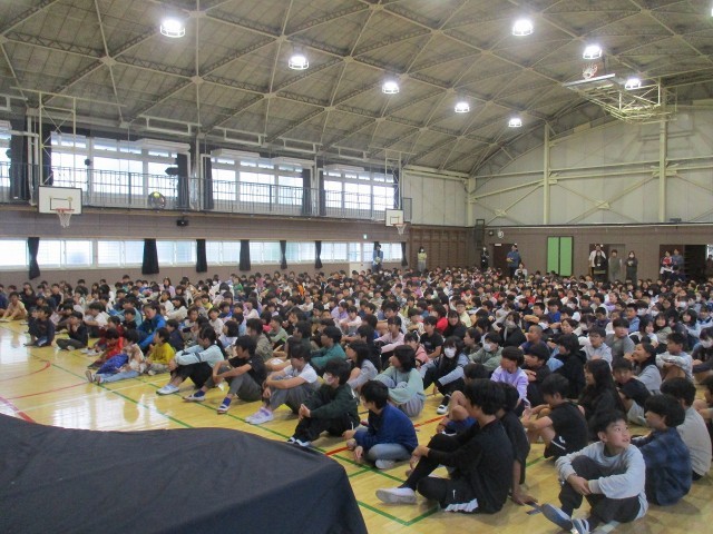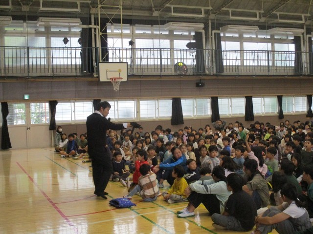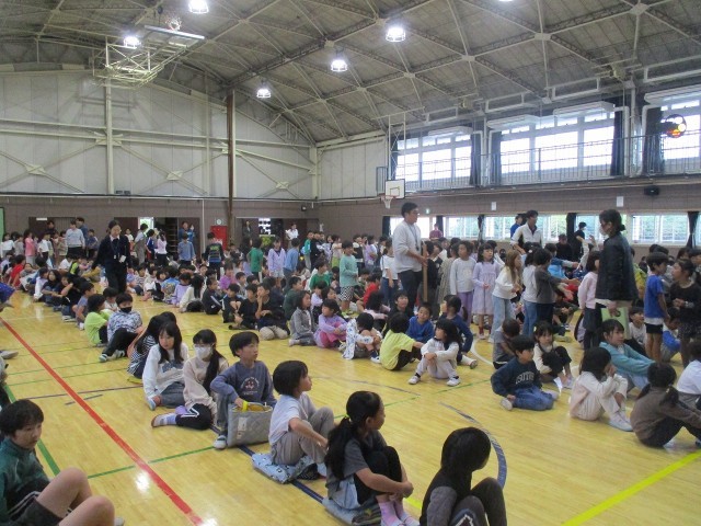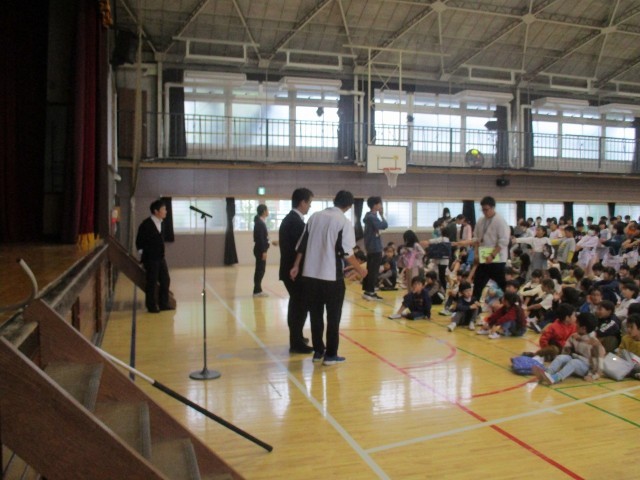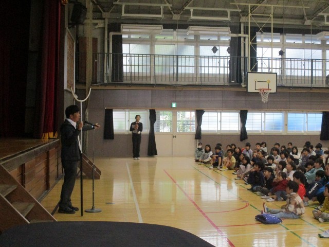 最後に体育館へ集合し、警察官の方々から本日の避難訓練についてお話しいただきました。学校の外で不審者に遭った時は、①お店や公園など、人の多い場所へ逃げること、②大声で周りの大人に知らせること、この2つが大切だと教えていただきました。