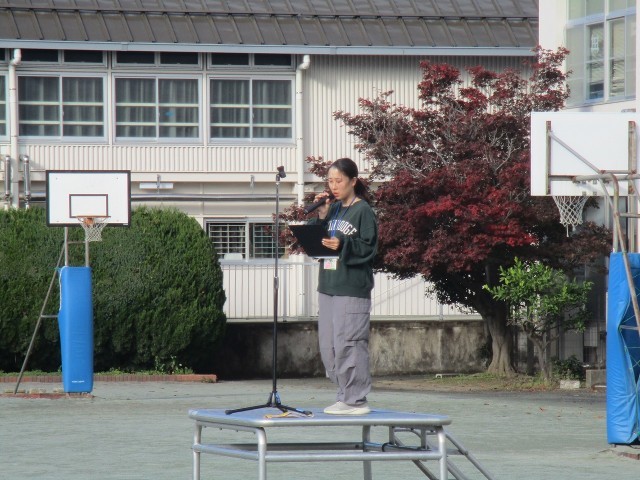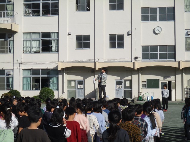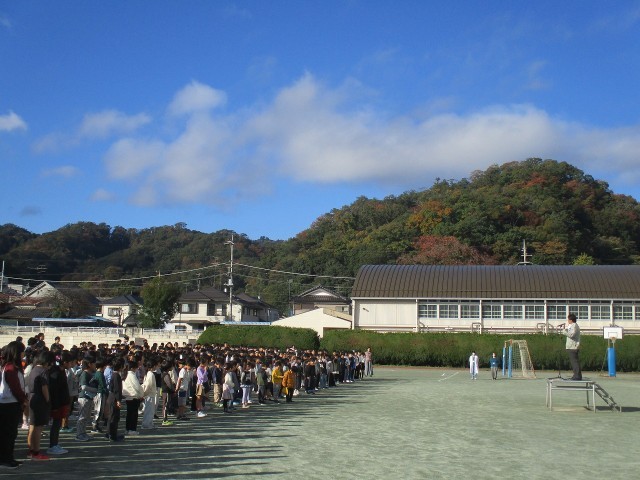 今日は11月の全校朝会でした。校庭に出ると遠くの山の紅葉が美しく、気持ちの良い青空が広がっていました。
