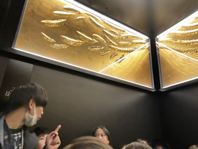 エレベーターには、4台・春夏秋冬の四季をモチーフにしたデザインが施されているそうようです。(※このエレベーターは秋)