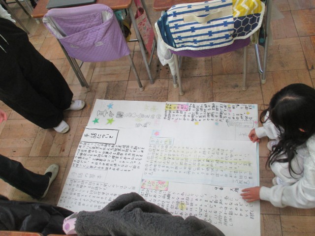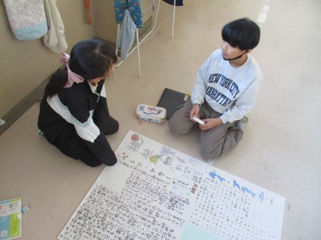 今日はグループごとに調べたことを模造紙に書き込んでいました。新聞のように題字を入れたりイラストを入れたりしながら、楽しそうに仕上げていました。