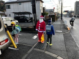 冷え込みの厳しい朝でしたが、通学路にはなんとサンタクロースが登場!学校安全ボランティアの方が、子供たちのためにサンタさんの衣装で温かく迎えてくださいました。