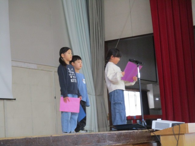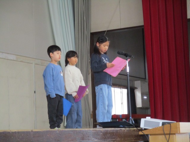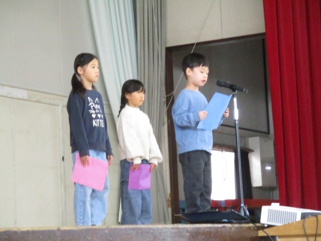 続いて児童代表の言葉は1年生です。緊張しながらもしっかりと作文を読み上げる姿に、大きな成長を感じました。読み終わるとたくさんの拍手を受け、嬉しそうでした。