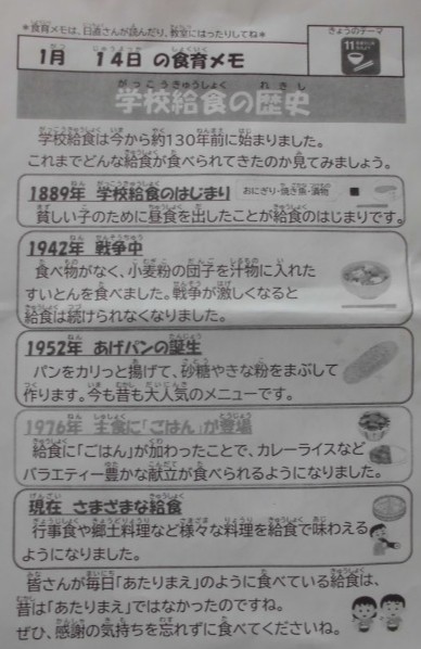 学校給食のより一層の充実と発展を図ることを目的としているそうですが、学校の給食の時間には時々お手紙が配られていて、給食のことを紹介しています。