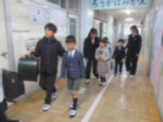保護者の方と登校した新1年生は、受付を済ませると新6年生のお兄さん・お姉さんに手を引かれ、1年生の教室へ。緊張した面持ちで席に座る姿も見られましたが、6年生が目線を合わせて優しくお世話をしてくれたおかげで、多くの子供たちに笑顔が戻りました。