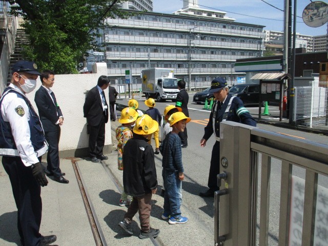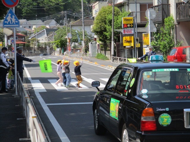 子供たちは、「前の人に付いていくだけではなく、自分の目で右・左・右をしっかり見る」という教えを意識し、真剣な表情で手を挙げて横断していました。
