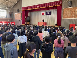 本日の8時45分に体育館に1年生から5年生が集まり、修了式を行いました。