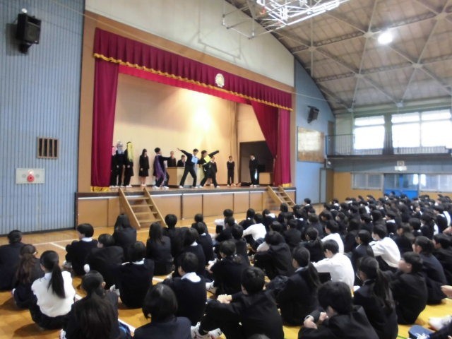整美委員からは、ハンカチを持ってきて、手洗い後に、床を汚さないよう呼びかけを、おなじみの劇を交えて、発表していました。