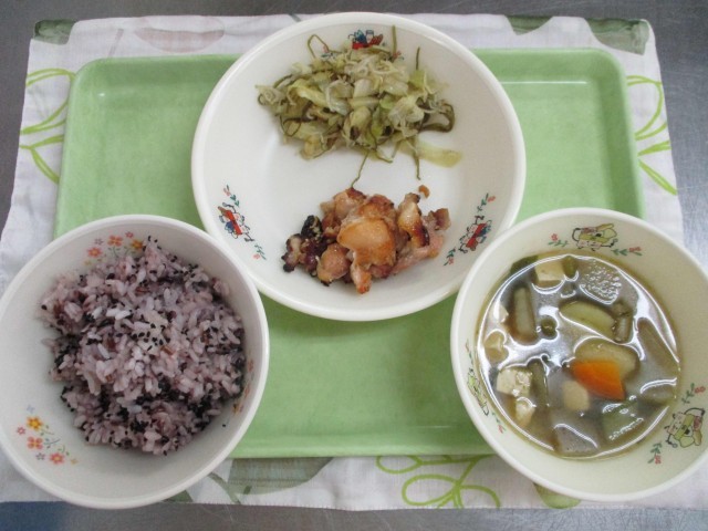 本日の献立は、古代米ごはん、鶏のみそ焼き、けんちん汁、じゃこキャベツ、牛乳でした...