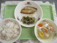本日の献立は、麦ごはん、さわらの幽庵焼き、かぼちゃのすいとん、煮びたし、牛乳でし...