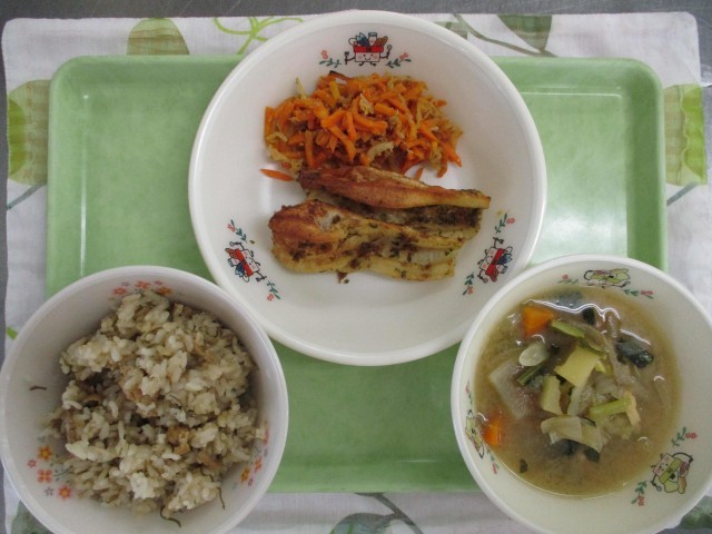 本日の献立は、ししじゅうし、ちくわのマヨネーズ焼き、人参しりしり、はっちくんのみそ汁、牛乳でした。