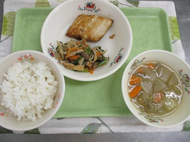 本日の献立は、ごはん、さわらの香味焼き、根菜ごま汁、彩り和え、牛乳でした。