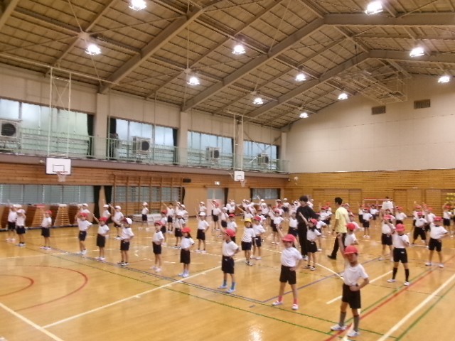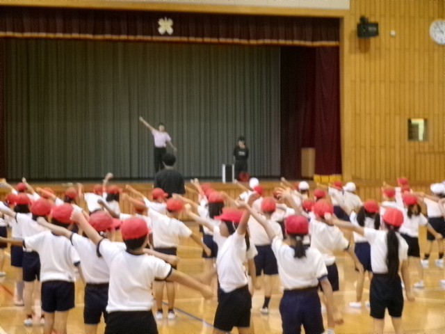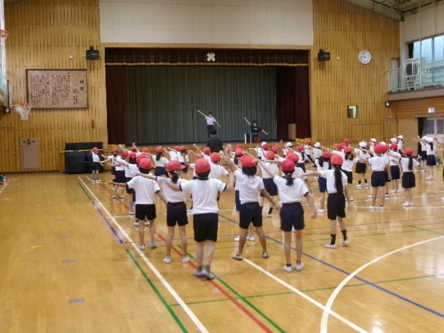 画像は1,2年生の運動会の表現の練習です。細かいところまでアドバイスを浮けながら振付を覚えていました。
