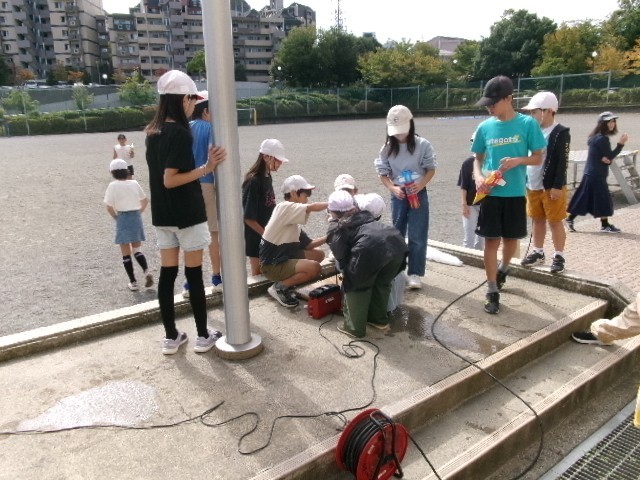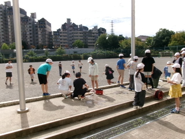 4年生は先日隣のクラスが行っていたペットボトルロケットの実験を、3年生は太陽と影の関係の観察を行っていました。