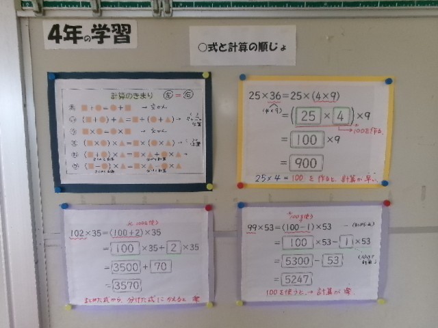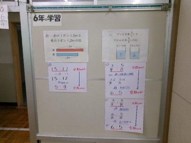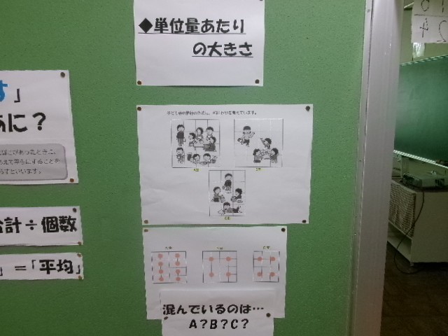 4階の算数室の廊下や教室の中には、各学年が今学習している単元の掲示物がたくさん貼ってあります。