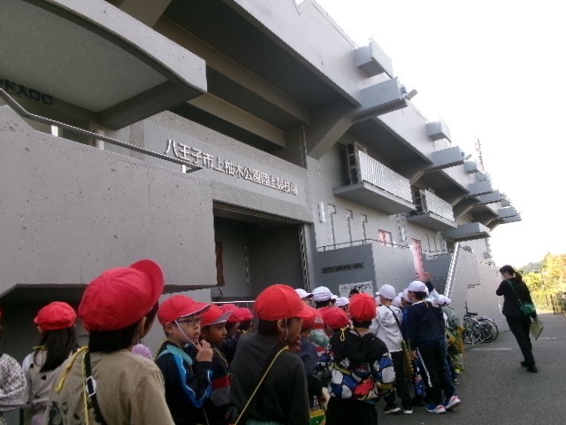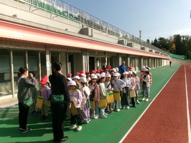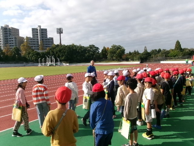 今日は2年生の生活科「とびだせ!町のたんけんたい」の学習で、上柚木陸上競技場へ行きました。