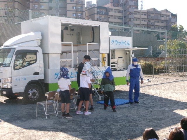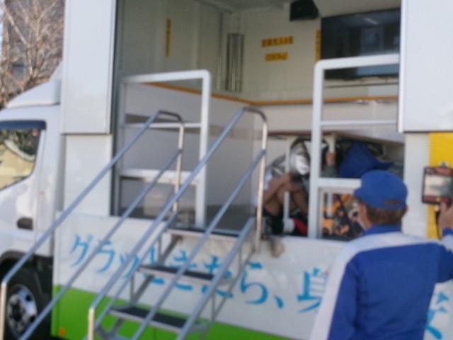 今日は避難訓練の後、代表の児童が起震車体験を行う様子をみんなで見ました。