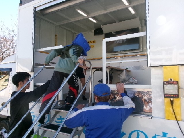 大きな揺れ具合に驚いていた児童もいました。また、起震車の方からは「防災頭巾の正しいかぶり方」「防災頭巾のあごのゴムが緩んでいたら修理してください」というお話がありました。少しでもけがや事故にあう可能性を少なくしてください、とのことでした。