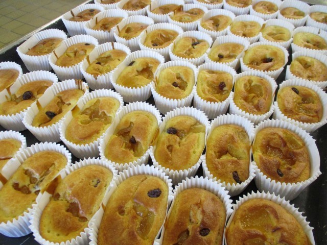 いまが旬のりんごを、甘く煮て、レーズンと一緒にヨーグルトの生地の上に乗せてオーブンで焼いています。