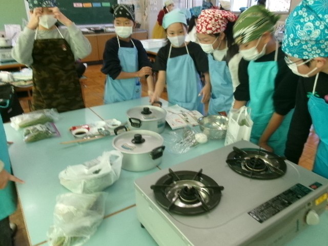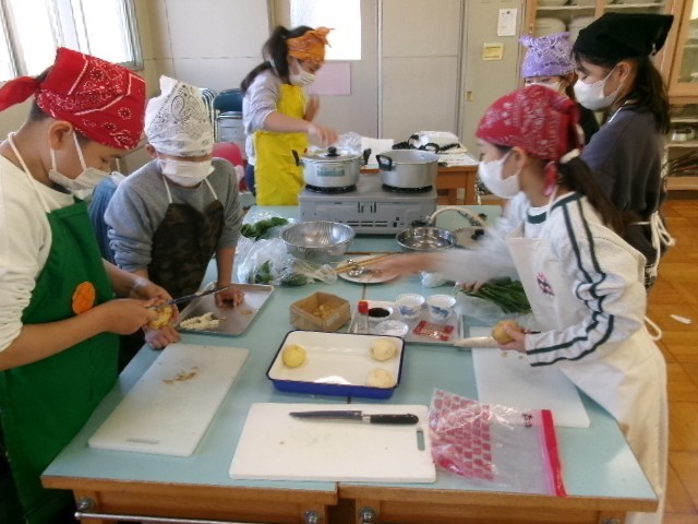 5年1組が調理実習を行っていました。ゆで野菜(ジャガイモや青菜)を作っていました。