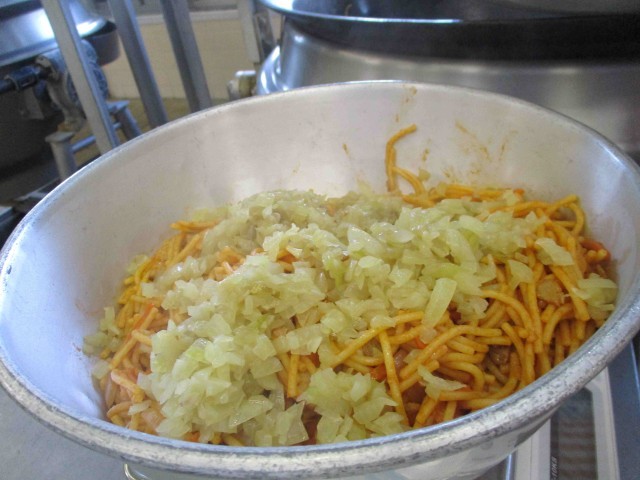 きざみ玉ねぎをたっぷりかけて、スパゲティに絡めて食べるのがポイントです!
