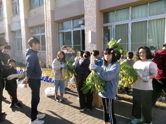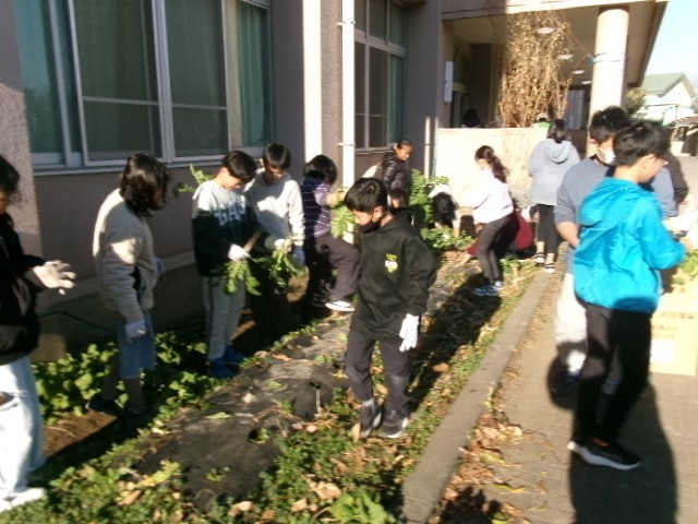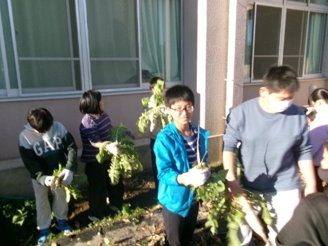 昨日の委員会活動で美化委員会が育ててきた大根を収穫していました。
