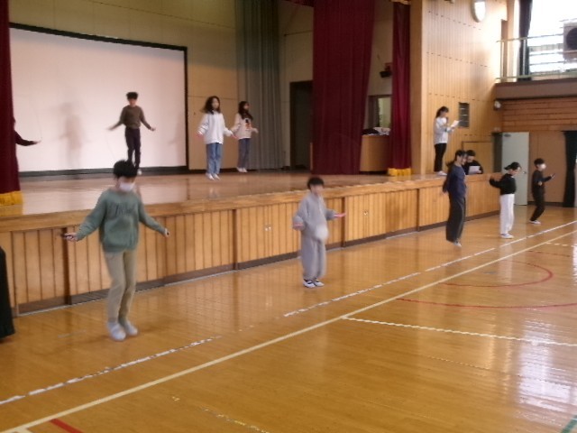 今日は全員で体を動かすのではなく、運動委員会の皆さんが「リズム縄跳び」を音楽に合わせて披露してくれました。
