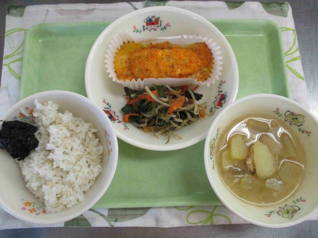 本日の献立は、麦ごはん、夕焼け小焼け焼き、のりの佃煮、呉汁、野菜の彩り和え、牛乳でした。