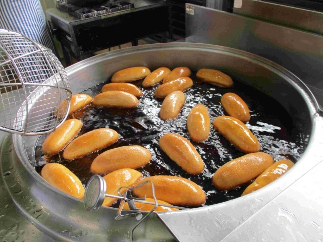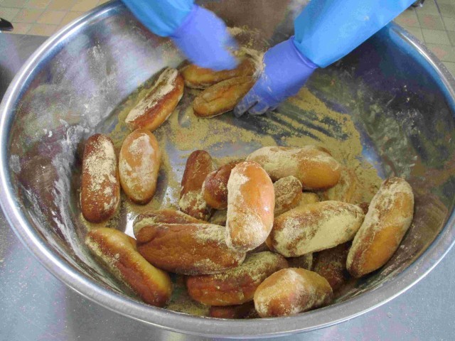 きなこ揚げパンは、油でカラッと揚げた後、砂糖・きな粉・塩をたっぷりまぶしています。