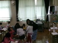 画像は、1年生が登校して朝の準備をしている様子です。6年生が当番制で朝早く登校し、準備を手伝ってくれています。